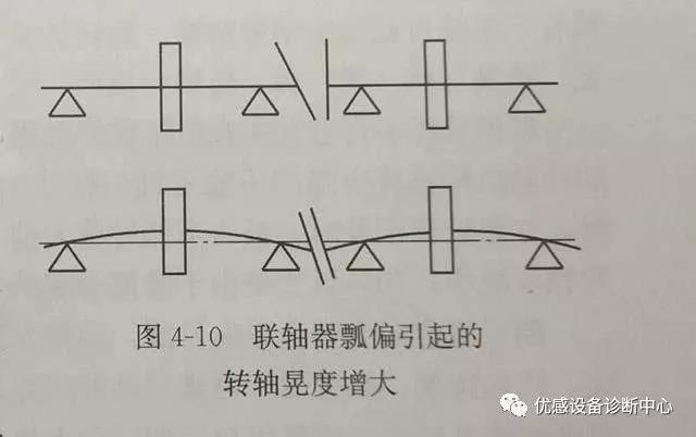 如圖4-10所示,當(dāng)聯(lián)軸器端面與軸中心線不垂直時,螺絲擰緊后,轉(zhuǎn)子將產(chǎn)生變形,軸頸處出現(xiàn)較大晃度。距離聯(lián)軸器越遠,轉(zhuǎn)子晃度越大。轉(zhuǎn)子撓曲變形不僅會產(chǎn)生較大的激振力,還會破壞動靜間隙,導(dǎo)致軸承烏金或者汽封等處產(chǎn)生摩擦。