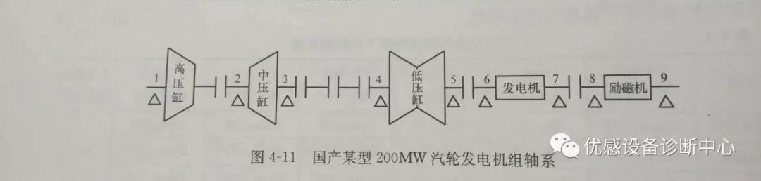 早期的國產(chǎn)200MW汽輪發(fā)電機組,如圖4-11所示,中壓和低壓轉(zhuǎn)子之間有一段跨距為4m、壁厚為0.04m的空心軸,又稱接長軸。該軸段剛性較差,在運行中晃動很大,容易引起3號、4號軸承振動超標(biāo),已經(jīng)成為這類機組的通病。該型機組在運行中應(yīng)嚴(yán)格防止接長軸承受沖擊扭矩如甩負荷、非同期并網(wǎng)等,檢修中應(yīng)盡可能減小接長軸與轉(zhuǎn)子對輪組裝后的晃動和瓢偏值。
