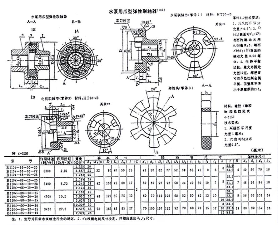 ⑤水泵行業(yè)的標準代號為Bl104,其 大許用轉矩為850N•m, 大軸徑為50mm